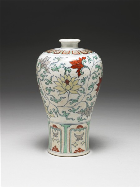 撇口,短頸,豐肩,腹上豐下斂,凹足。以筆繪青花圖紋邊框填以五彩釉料,稱之為鬥彩,肩部飾蓮瓣紋,腹部上段飾纏枝番蓮花紋,下段為綠底白色花瓣形開光,內繪幾何紋及花卉裝飾,各段圖文間皆有兩道弦紋框邊。肩部蓮瓣紋內側有青花書「大明成化年製」單行楷款。