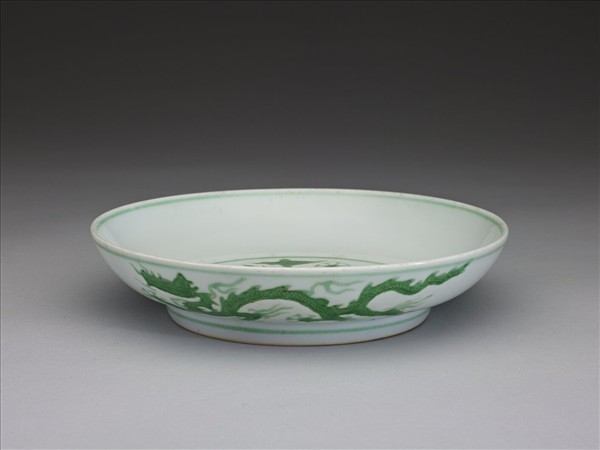侈口,淺壁弧形,矮圈足。盤心與外壁刻畫雲龍三條,外壁隙地淺劃雙珠、波濤紋。薄胎白釉,龍紋加填綠彩,口足內外分畫綠線四道。底有青花書「大明正德年製」二行六字楷款,外加雙圈。