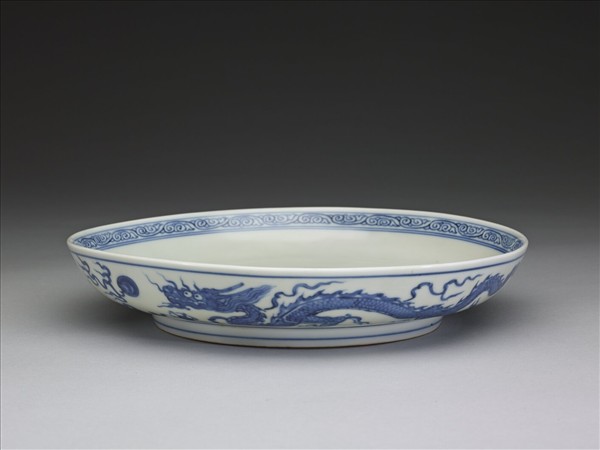 侈口,淺壁弧形,矮圈足。內面口沿下畫勾雲一週,盤心畫雲紋三朵,週壁無紋飾。外壁畫雙龍戲珠,加飾朵雲。內外分飾青線八道。底有青花書「大明正德年製」二行六字楷款,外加雙圈。