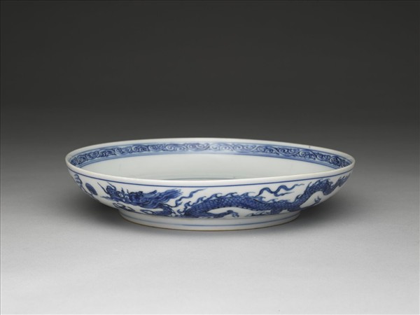 侈口,淺壁弧形,矮圈足。內面口沿下畫勾雲一週,盤心畫雲紋三朵,週壁無紋飾。外壁畫雙龍戲珠,加飾朵雲。內外分飾青線八道。底有青花書「大明正德年製」二行六字楷款,外加雙圈。