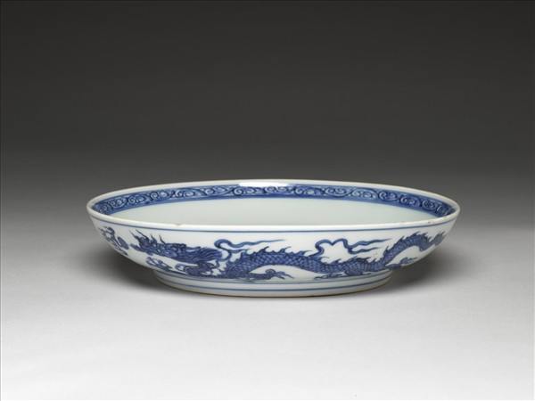 侈口,淺壁弧形,矮圈足。內面口沿下畫勾雲一週,盤心畫雲紋三朵,週壁無紋飾。外壁畫雙龍戲珠,加飾朵雲。內外分飾青線八道。底有青花書「大明正德年製」二行六字楷款,外加雙圈。