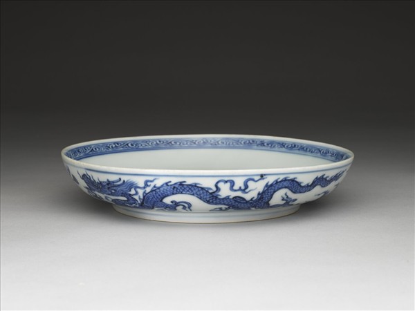 侈口,淺壁弧形,矮圈足。內面口沿下畫勾雲一週,盤心畫雲紋三朵,週壁無紋飾。外壁畫雙龍戲珠,加飾朵雲。內外分飾青線八道。底有青花書「大明正德年製」二行六字楷款,外加雙圈。