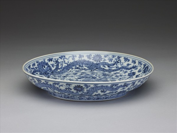 侈口窄唇,淺壁,矮圈足。盤內外分畫青龍五條,加飾纏枝番蓮花,足上畫如意雲紋一週,花紋間分飾青線八道。底有青花書「正德年製」二行四字楷款,外加雙圈。