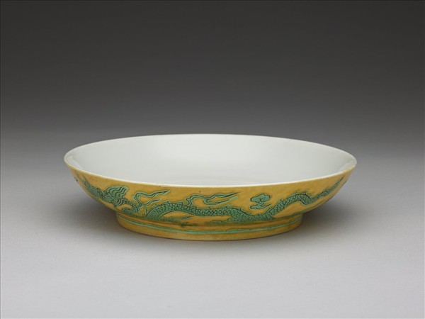 侈口,淺壁,矮圈足。外壁刻畫雙龍戲珠紋,足刻淺線一道。嬌黃釉,花紋加填綠彩。內面純白,樸素無紋飾。底有青花書「正德年製」二行四字楷款,外加雙圈。