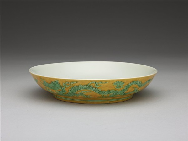侈口,淺壁,矮圈足。外壁刻畫雙龍戲珠紋,足刻淺線一道。嬌黃釉,花紋加填綠彩。內面純白,樸素無紋飾。底有青花書「正德年製」二行四字楷款,外加雙圈。