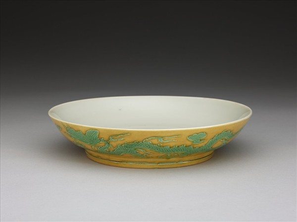 侈口,淺壁,矮圈足。外壁刻畫雙龍戲珠紋,足刻淺線一道。嬌黃釉,花紋加填綠彩。內面純白,樸素無紋飾。底有青花書「正德年製」二行四字楷款,外加雙圈。