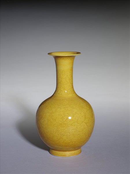 黃釉劃花番蓮紋瓶