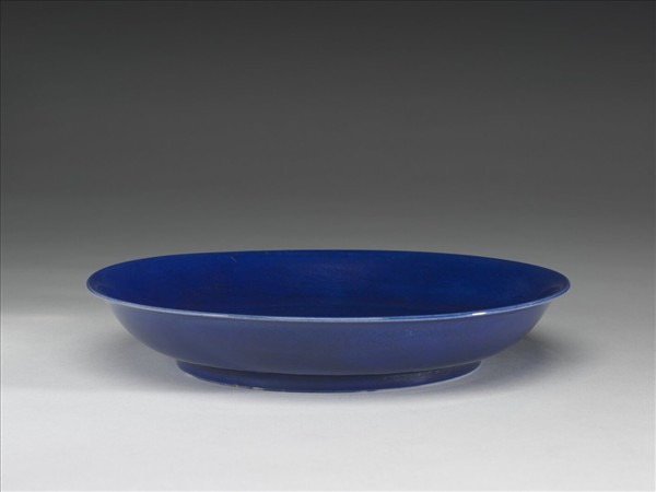 侈口,淺壁弧形,矮圈足。盤心及外壁分劃趕珠雲龍紋五條,底邊劃蓮瓣紋一周。胎質較薄,內外滿施霽青釉,盤底純白。底有青花書「大明嘉靖年製」六字二行楷款,外加雙圈。