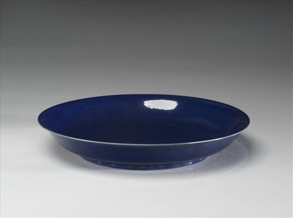 侈口,淺壁弧形,矮圈足。盤心及外壁分劃趕珠雲龍紋五條,底邊劃蓮瓣紋一周。胎質較薄,內外滿施霽青釉,盤底純白。底有青花書「大明嘉靖年製」六字二行楷款,外加雙圈。