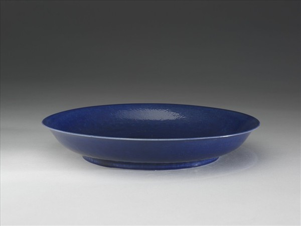 侈口,淺壁弧形,矮圈足。盤心及外壁分劃趕珠雲龍紋五條,底邊劃蓮瓣紋一周。胎質較薄,內外滿施霽青釉,盤底純白。底有青花書「大明嘉靖年製」六字二行楷款,外加雙圈。