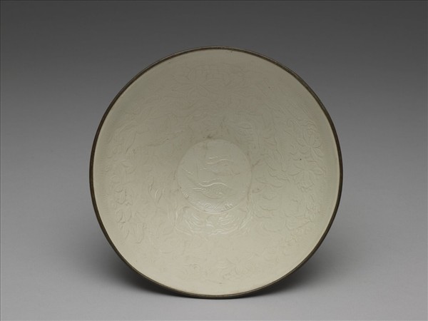 中型碗,侈口、弧形深壁、圈足,口鑲銅棱釦。器內以印花為飾,口沿下印回紋一道,周壁印蓮荷花葉與水生植物,紋飾繁細密佈,幾無隙地。底心印水波游魚兩尾,鱗片可數。此種繁花密佈,各個花葉、魚水細節模印精緻者,經常能見於南宋遺址。