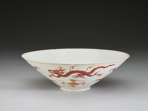 甜白釉描紅五龍紋葵瓣口碗