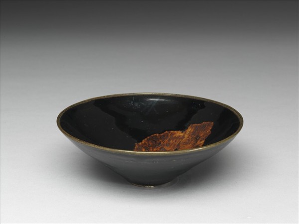北宋中葉後,講究飲茶藝術的文士們喜愛用黑色茶碗來襯托白色的茶湯,一時黑色茶碗的製作從福建建窯擴及南北大窯場,且各具特色。此碗碗壁斜敞呈斗笠式,上釉後再以刀修整勒刻出足型,小圈足,底淺凹,底心凸起。胎色米白,外壁烏亮的黑釉下能見明顯之輪製痕。器內黑釉間飾一大片黃色的木葉紋。匠者係先在器上施淡黃釉,而後貼上處理過的木葉,再施一層富含鐵份的黑釉,入窯燒成;寫實中另有令人玩味的詩意。據吉州窯古法燒製實驗,因桑葉中富含鋅、鐵、銅、錳、鈣等微量元素,似乎也只有桑葉才能燒出木葉盞。此係江西吉州窯獨樹一幟的作風;該窯盛於五代至元,各種色釉、繪飾外,尤擅利用釉中含鐵量的不同而表現紋飾間顏色對比的美感,作剪紙、木葉、玳瑁斑等饒富趣味的裝飾。本器碗內,似曾貼或畫金銀之梅花枝與彎月,但金銀色脫落,僅對光時能見其落筆迅捷優美的梅枝。此種梅枝彎月的圖形常見於南宋至元代的吉州窯作品。