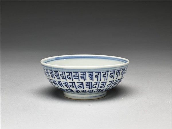 敞口,淺壁弧形,矮圈足。外壁青花書梵文三層,底心書一字,內外分飾青線八道,內面純白無紋飾。底有青花書「大明萬曆年製」六字二行楷款,外加雙圈。