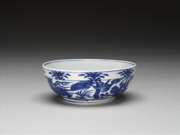 敞口,淺壁,矮圈足。外壁畫二仙人跨虎,間飾麒麟、松樹等,口沿下畫花卉紋一周。碗心畫雲龍一條,內壁純白無紋飾。底有青花書「大明萬曆年製」六字二行楷款,外加雙圈。