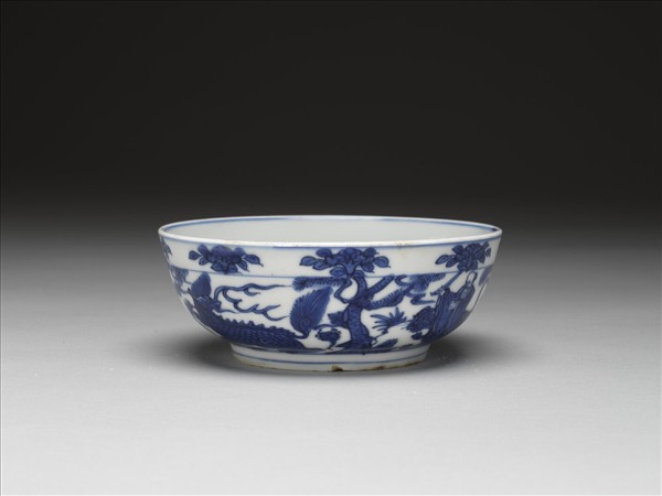 敞口,淺壁,矮圈足。外壁畫二仙人跨虎,間飾麒麟、松樹等,口沿下畫花卉紋一周。碗心畫雲龍一條,內壁純白無紋飾。底有青花書「大明萬曆年製」六字二行楷款,外加雙圈。