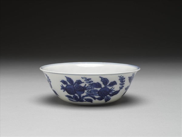 侈口,深壁,矮圈足。外壁畫石榴、桃等四折枝,碗心畫牡丹、菊花等,內壁純白無紋飾,口足內外分飾青線八道。底有青花書「大明萬曆年製」六字二行楷款,外加雙圈。