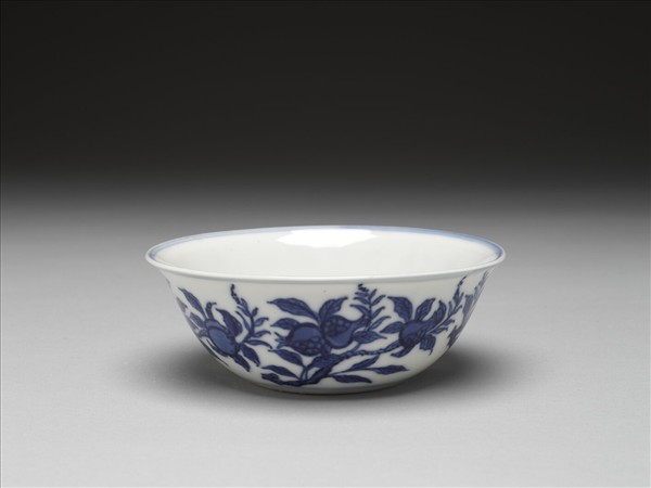 侈口,深壁,矮圈足。外壁畫石榴、桃等四折枝,碗心畫牡丹、菊花等,內壁純白無紋飾,口足內外分飾青線八道。底有青花書「大明萬曆年製」六字二行楷款,外加雙圈。