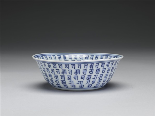 侈口窄唇,深壁,矮圈足。外壁青花書梵文五層,內壁五層,內外加飾青線七道。碗心中央的梵文,藏語音譯為「朗久旺丹」,中文稱為「十相自在」,由七個梵文和三個符號組合而成。底有青花書「大明萬曆年製」六字二行楷款,外加雙圈。
