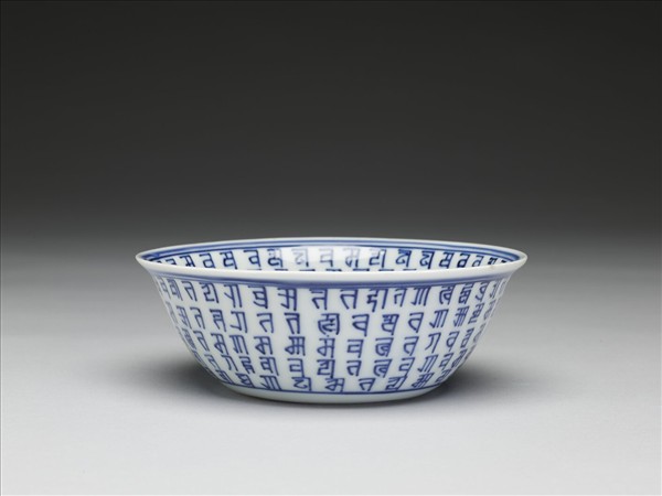 侈口窄唇,深壁,矮圈足。外壁青花書梵文五層,內壁五層,內外加飾青線七道。碗心中央的梵文,藏語音譯為「朗久旺丹」,中文稱為「十相自在」,由七個梵文和三個符號組合而成。底有青花書「大明萬曆年製」六字二行楷款,外加雙圈。