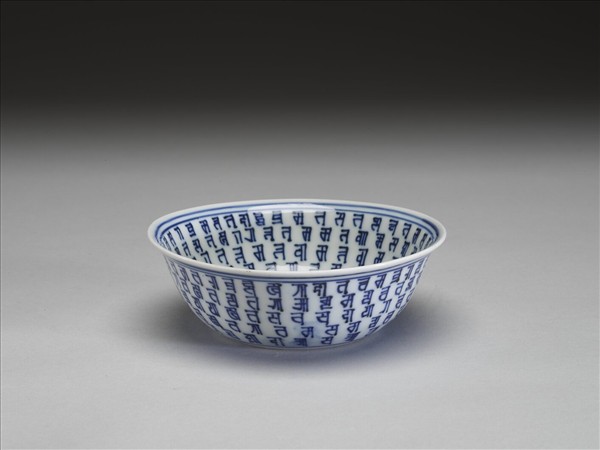 侈口窄唇,深壁,矮圈足。外壁青花書梵文五層,內壁五層,內外加飾青線七道。碗心中央的梵文,藏語音譯為「朗久旺丹」,中文稱為「十相自在」,由七個梵文和三個符號組合而成。底有青花書「大明萬曆年製」六字二行楷款,外加雙圈。