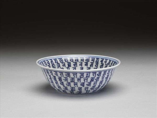 侈口窄唇,深壁,矮圈足。外壁青花書梵文五層,內壁五層,內外加飾青線七道。碗心中央的梵文,藏語音譯為「朗久旺丹」,中文稱為「十相自在」,由七個梵文和三個符號組合而成。底有青花書「大明萬曆年製」六字二行楷款,外加雙圈。