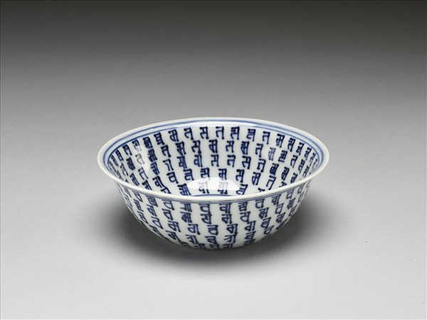 侈口窄唇,深壁,矮圈足。外壁青花書梵文五層,內壁五層,內外加飾青線七道。碗心中央的梵文,藏語音譯為「朗久旺丹」,中文稱為「十相自在」,由七個梵文和三個符號組合而成。底有青花書「大明萬曆年製」六字二行楷款,外加雙圈。