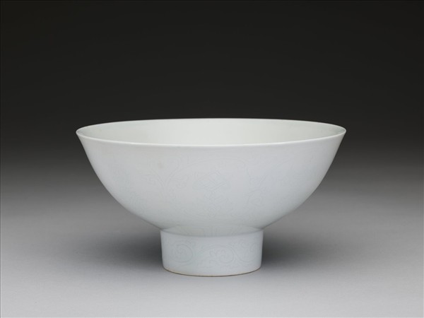 侈口窄唇,深弧壁,高圈足。外壁劃花纏枝番蓮,加飾八寶紋,底邊劃蓮瓣紋一周,足上畫卷草紋一周。內面純白無紋飾,碗心有「大明宣德年製」六字二行楷款,外加雙圈。