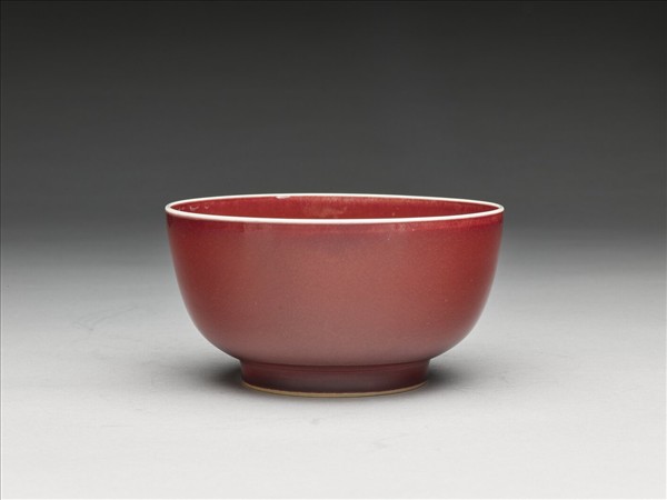 敞口,深壁,矮圈足。胎骨稍厚,內外滿施深紅釉,碗底純白,口沿薄釉,銅元素揮發呈一道白邊,圈足底緣露胎一圈。底有青花書「大明宣德年製」六字二行楷款,外加雙圈。