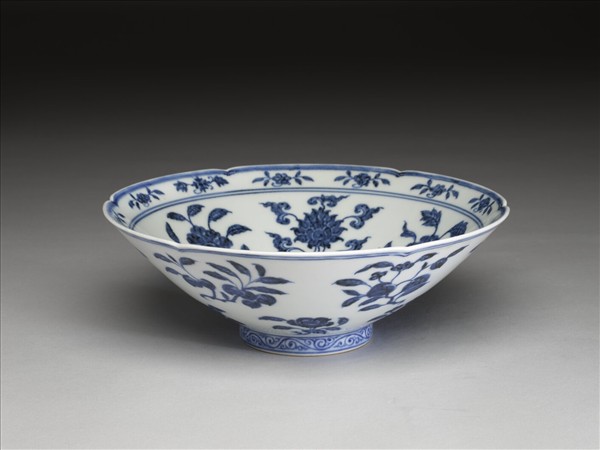 六瓣葵花形口,深壁,矮圈足。碗內口沿下兩道弦紋間畫各種花卉十二朵,內壁畫四季花卉六枝,底心三圈弦紋內畫桃實一枝。外壁口沿下弦紋兩道,器身畫折枝花、果分上下二層各六枝。足壁上下圈畫弦紋兩道,內飾卷草紋一周。底有青花書「大明宣德年製」六字二行楷款,外加雙圈。