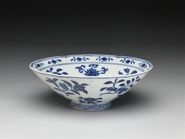 六瓣葵花形口,深壁,矮圈足。碗內口沿下兩道弦紋間畫各種花卉十二朵,內壁畫四季花卉六枝,底心三圈弦紋內畫桃實一枝。外壁口沿下弦紋兩道,器身畫折枝花、果分上下二層各六枝。足壁上下圈畫弦紋兩道,內飾卷草紋一周。底有青花書「大明宣德年製」六字二行楷款,外加雙圈。