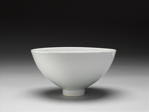 圓直口,深弧壁,小圈足,碗心內凹呈尖底狀,底微凸,俗稱雞心碗,一般因其碗形頗似蓮房,俗又稱「蓮子碗」。外口沿下、圈足淺劃回紋一圈,周壁刻劃蓮瓣紋一圈,內壁無紋。胎骨較薄,通體施甜白釉,圈足露胎處,質堅細膩。底青花書「大明宣德年製」二行六字楷款。本院所藏宣德甜白釉蓮子碗,有大中小三種,其紋飾可分甜白無紋與刻劃紋飾兩類,紋飾亦有繁、簡之分,紋飾分類與青花蓮子碗大致相同。