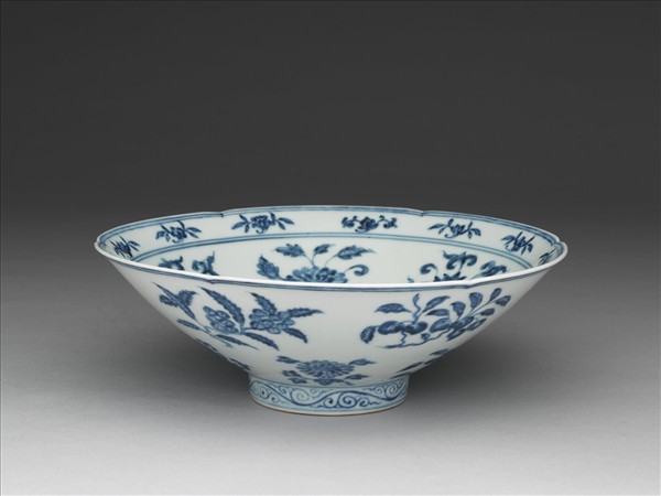 六瓣葵花形口,深壁,矮圈足。碗內口沿下兩道弦紋間畫各種花卉十二朵,內壁畫四季花卉六枝,底心三圈弦紋內畫桃實一枝。外壁口沿下弦紋兩道,器身畫折枝花、果分上下二層各六枝。足壁上下圈畫弦紋兩道,內飾卷草紋一周。底有青花書「大明宣德年製」六字二行楷款,外加雙圈。