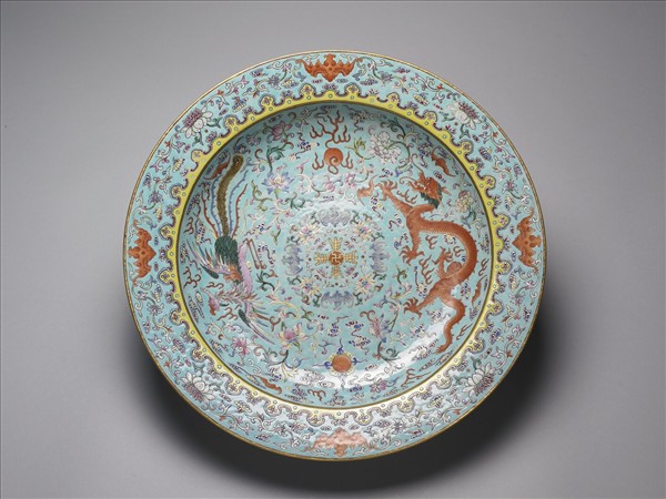大撇口,有斜板形折邊,淺弧形壁,圈足。全器施湖綠色釉,唯圈足底露白色胎,器緣鑲銅圈,餘各有折處皆繪金線。器心寫「卍」、「壽」,外飾蝠與蓮一圈,面與外壁各繪龍鳳一對,隙地繪蓮花、蝙蝠、雲紋與火珠紋。器底有白釉底朱書「大清嘉慶年製」篆款。全器紋飾繁複精細,用色講究流利。