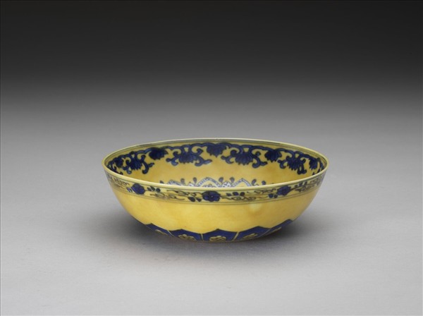 敞口窄唇,深壁弧形,凸底,矮圈足。內壁畫花卉及桃形圖案各一周,碗心畫四連桃形圖案一枚,外飾纏枝花卉紋一周。外壁口沿下畫纏枝花卉一道,周壁畫蓮瓣紋,內飾梅花,底邊回紋一道。原為白地青花,加施黃釉一層。