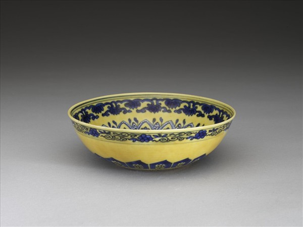敞口窄唇,深壁弧形,凸底,矮圈足。內壁畫花卉及桃形圖案各一周,碗心畫四連桃形圖案一枚,外飾纏枝花卉紋一周。外壁口沿下畫纏枝花卉一道,周壁畫蓮瓣紋,內飾梅花,底邊回紋一道。原為白地青花,加施黃釉一層。