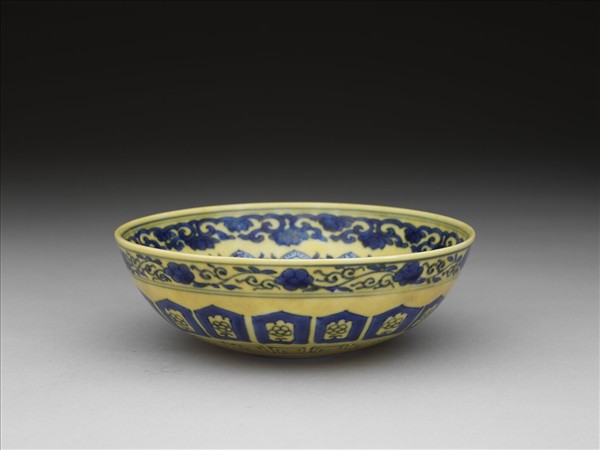 敞口窄唇,深壁弧形,凸底,矮圈足。內壁畫花卉及桃形圖案各一周,碗心畫四連桃形圖案一枚,外飾纏枝花卉紋一周。外壁口沿下畫纏枝花卉一道,周壁畫蓮瓣紋,內飾梅花,底邊回紋一道。原為白地青花,加施黃釉一層。