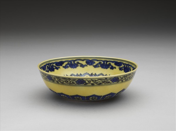 敞口窄唇,深壁弧形,凸底,矮圈足。內壁畫花卉及桃形圖案各一周,碗心畫四連桃形圖案一枚,外飾纏枝花卉紋一周。外壁口沿下畫纏枝花卉一道,周壁畫蓮瓣紋,內飾梅花,底邊回紋一道。原為白地青花,加施黃釉一層。