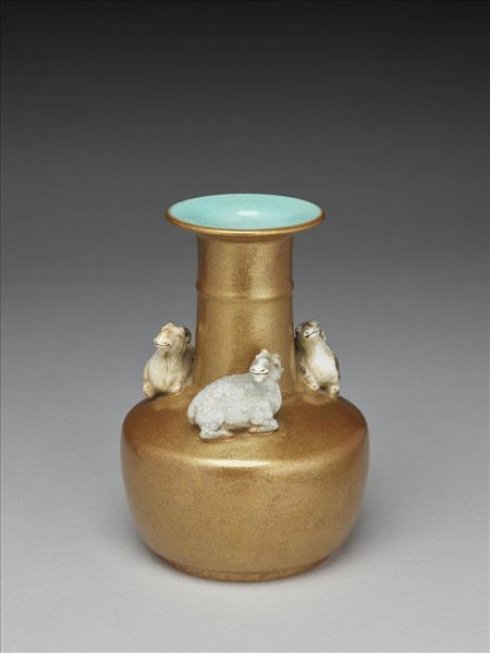 瓶作盤口、直頸、斜肩、廣腹、矮圈足,外施金彩,內罩湖綠色釉,底以金彩書「大清乾隆年製」六字篆款,頸部劃弦紋一道,肩上堆塑三隻蹲臥的吉羊,象徵「三羊開泰」。宮廷御用器皿喜以吉祥圖案為飾,故於造辦處檔案中亦能發現乾隆希望御窯廠能夠「各按時令」。在瓷器上彩繪「吉祥花樣」。其中「年節用三羊開泰」,故知此件作品的題材不僅反映出當時的風尚,而且具體呈現乾隆官窯燒造「像生瓷」的事實。以立體塑形的人物、花果及鳥獸來裝飾瓷瓶,或本身即為一件獨立完整的瓷塑,稱為「像生瓷」。此技法截然不同於傳統瓷器的表現,其最大的特色在於突破平面繪畫的格局,而能以立體的物像凸顯器物的藝術效果。此類作品在康熙時期已出現,乾隆官窯進一步燒造生動靈活的「三子瓶」、「五子瓶」及「瓷牧童」等。