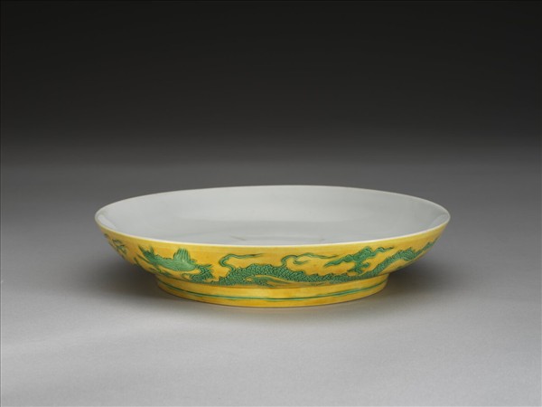 侈口,淺壁,矮圈足。外壁刻畫雙龍戲珠紋,足刻淺線一道。嬌黃釉,花紋加填綠彩。內面純白,樸素無紋飾。底有青花書「正德年製」二行四字楷款,外加雙圈。