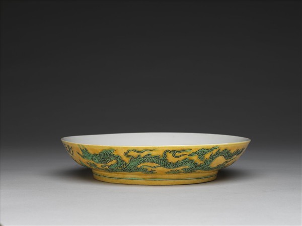 侈口,淺壁,矮圈足。外壁刻畫雙龍戲珠紋,足刻淺線一道。嬌黃釉,花紋加填綠彩。內面純白,樸素無紋飾。底有青花書「正德年製」二行四字楷款,外加雙圈。