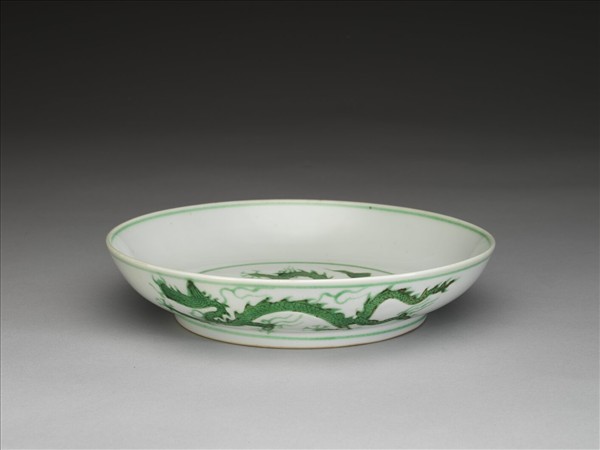 敞口,淺壁弧形,矮圈足。盤心與外壁刻畫雲龍三條,外壁隙地淺劃雙珠、波濤紋。薄胎白釉,龍紋加填綠彩,口足內外分畫綠線四道。底有青花書「大明正德年製」六字二行楷款,外加雙圈。