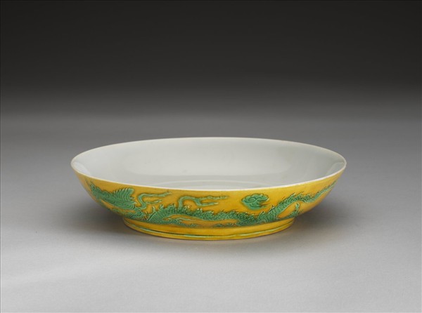 侈口,淺壁,矮圈足。外壁刻畫雙龍戲珠紋,足刻淺線一道。嬌黃釉,花紋加填綠彩。內面純白,樸素無紋飾。底有青花書「正德年製」二行四字楷款,外加雙圈。