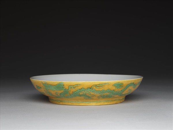 侈口,淺壁,矮圈足。外壁刻畫雙龍戲珠紋,足刻淺線一道。嬌黃釉,花紋加填綠彩。內面純白,樸素無紋飾。底有青花書「正德年製」二行四字楷款,外加雙圈。