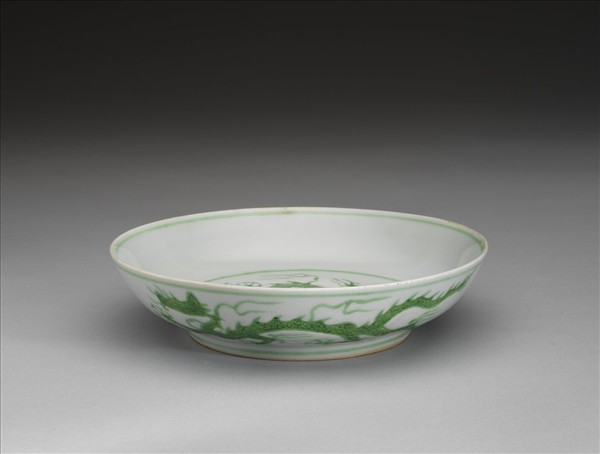 敞口,淺壁弧形,矮圈足。盤心與外壁刻畫雲龍三條,外壁隙地淺劃雙珠、波濤紋。薄胎白釉,龍紋加填綠彩,口足內外分畫綠線四道。底有青花書「大明正德年製」六字二行楷款,外加雙圈。