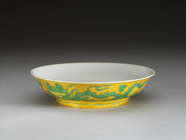 侈口窄唇,淺壁,矮圈足。胎骨較薄。內面純白釉,樸素無紋飾。外壁嬌黃釉地,錐拱雙雲龍戲珠紋,加填綠彩。足圈飾綠線一道。底有青花書「正德年製」四字二行楷款,外加雙圈。
