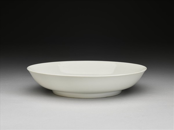 侈口,淺壁弧形,矮圈足。胎質較薄,通體甜白釉,樸素無紋飾。底有青花書「大明弘治年製」六字二行楷款,外加雙圈。