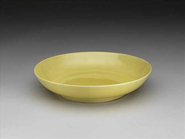侈口,淺壁弧形,矮圈足。胎質較薄,內外滿施嬌黃釉,盤底純白,樸素無紋飾。底均有青花書「大明弘治年製」六楷字款,外加雙圈。