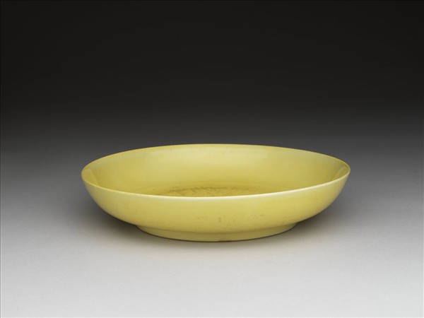 敞口,淺壁弧形,矮圈足。器內外壁滿施嬌黃釉,盤底純白,樸素無紋飾。底有青花書「大明弘治年製」六字二行楷款,外加雙圈。