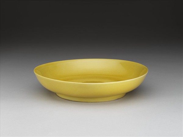 敞口,淺壁弧形,矮圈足。器內外壁滿施嬌黃釉,盤底純白,樸素無紋飾。底有青花書「大明弘治年製」六字二行楷款,外加雙圈。
